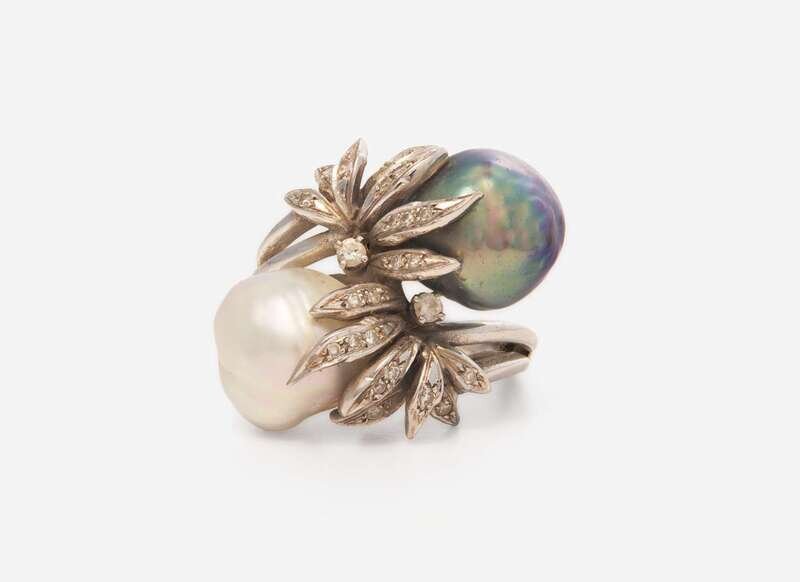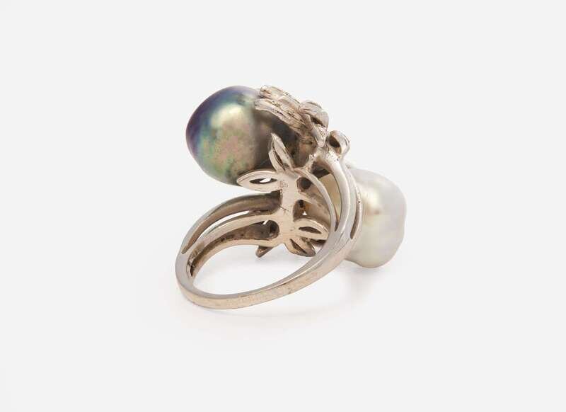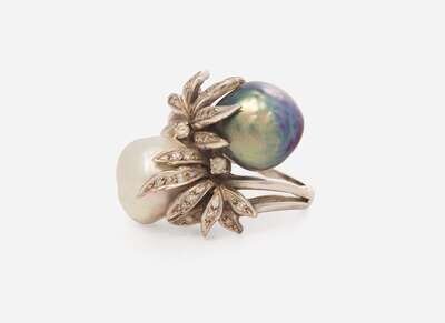 A 14K white gold ring, set with two baroque pearls, one South Sea, one Tahitian, set in fronds of white gold set single-cut and round brilliant-cut diamonds. Diamonds are near colorless (G – J), with SI – I clarity. Total estimated weight of diamonds: 0.18 carats.