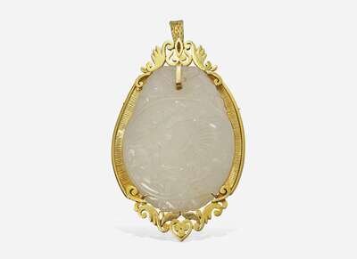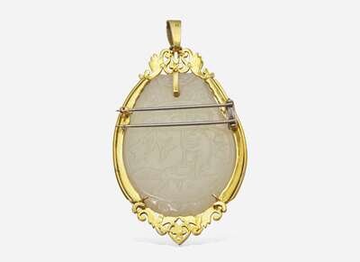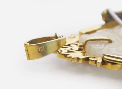 Overall Condition: Minor scratches and signs of wear, pin and clasps in working order, stamped “14K”, set with a carved jade stone measuring approximately 38.85mm x 51.70mm x 6.00mm.