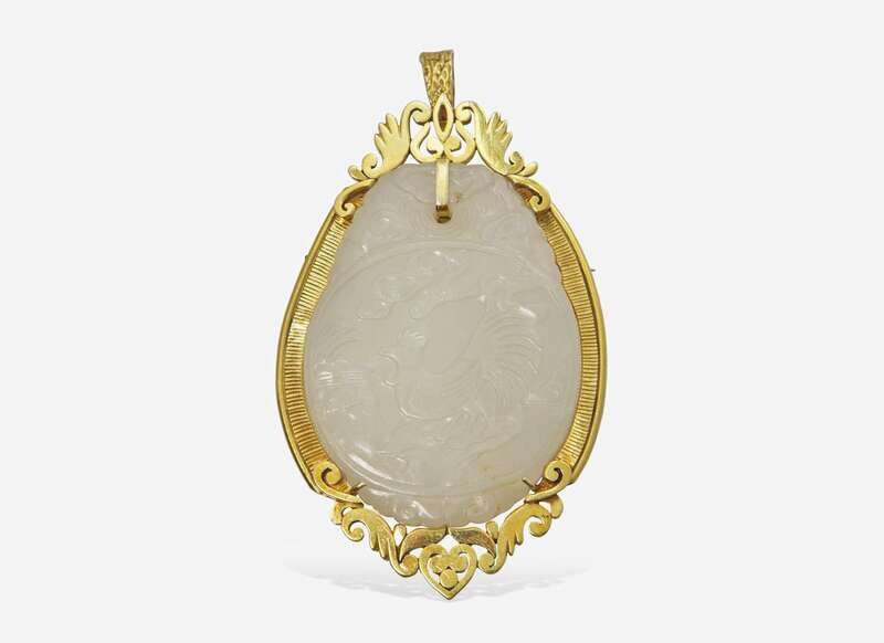 A 14K yellow gold brooch also functioning as a pendant, featuring a large carved jade stone depicting a rooster on the front, and a rodent on the reverse.