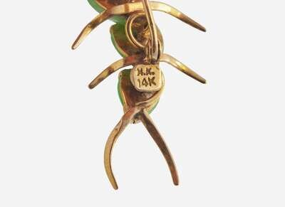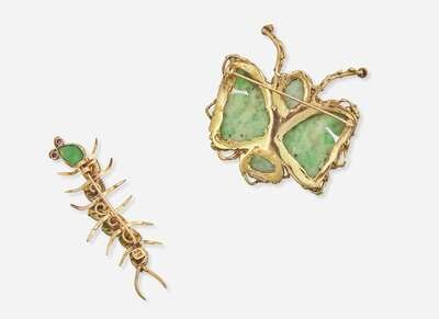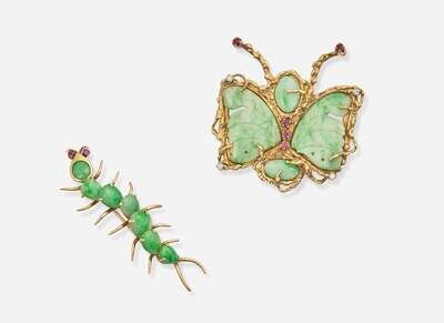 A set of two jade brooches, one crafted from 14K yellow gold and designed as a caterpillar, with a body comprised of smooth pear-shape jade and antenna topped with round-cut pink spinel, and one crafted from 14K yellow gold and designed as a butterfly, with carved jade wings and body, antenna topped with round-cut pink spinel, and spinel and round brilliant-cut diamonds accents on the body. Diamonds are near colorless (G – J), with SI – I clarity. Total estimated weight of diamonds: 0.12 carats.