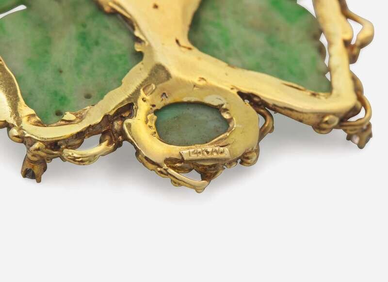 Butterfly: Some scratches and wear to metal, some glue visible on the back of the brooch, stamped “14KAU”, clasp in working order, set with two carved jade wings each measuring approximately 17.14mm x 25.32mm, two oval-cut jade each measuring approximately 8.00mm x 11.80mm, five round-cut pink spinel each measuring approximately 2.30mm, and four round brilliant-cut diamonds each measuring approximately 2.10mm, near colorless (G – J), with SI – I clarity. Total estimated weight of diamonds: 0.12 carats.