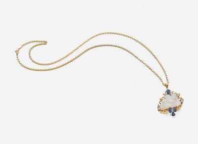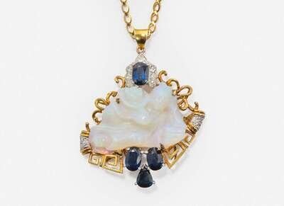 An 18K yellow gold pendant featuring an asymmetrically carved opal, with accents of oval-cut and pear-cut sapphires, and single-cut diamonds, on a 14K yellow gold chain. Diamonds are near colorless to faint color (H – L), with SI – I clarity. Total estimated weight of diamonds: 0.22 carats.