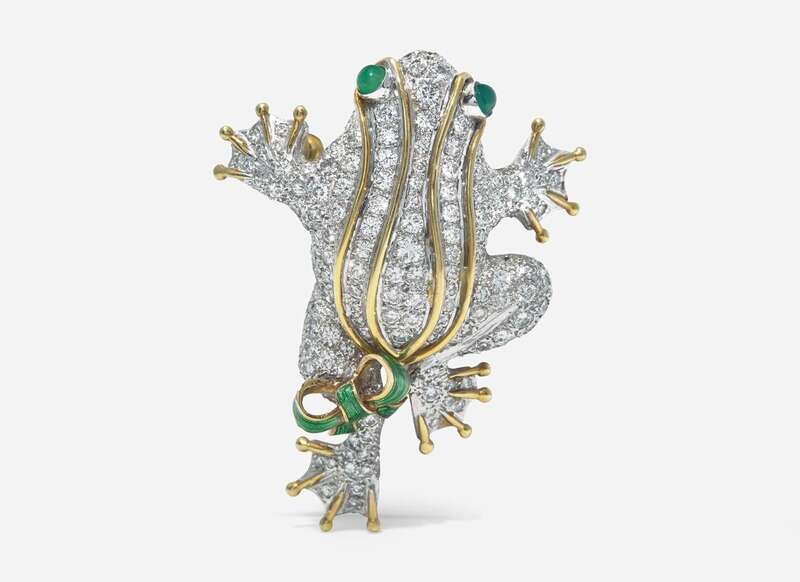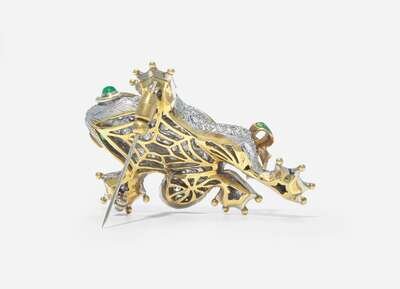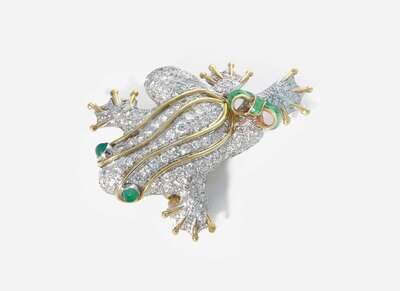 A two-tone 18K yellow and white gold brooch designed as a frog, set throughout on the body with pavé-set round brilliant-cut diamonds in white gold, with ridges of smoothed yellow gold down the body and creating the webbing of the frog's toes, two round cabochon emeralds for eyes, and a green enamel bow accent at the base of the frog's body. The diamonds are near colorless (G - J), with VS - SI clarity. Total estimated weight of diamonds: 2.75 carats.