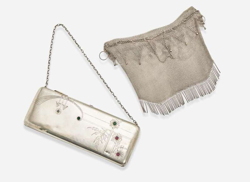 A collection of two sterling silver purses, including an Art Deco Russian sterling silver purse designed as a clutch with a short oval-link chain strap, with engraved details accented by cabochon blue, green, pink, and purple glass stones, together with a mesh drawstring-style bag completed by a fringe along the bottom and silver bauble accents along the opening.