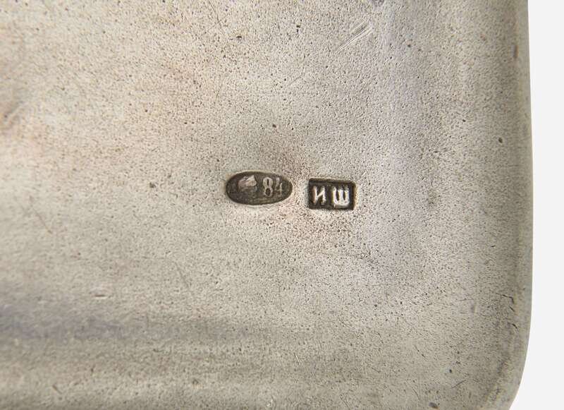 Russian Purse: Significant scratches, wear, and discoloration to metal consistent with age, chips, damage, and abrasions to glass stones, hinges and clasp in working order, chain intact, stamped with Russian hallmarks, testing as sterling silver, a few dents to metal.