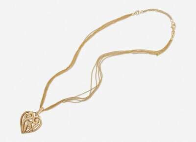 An 18K yellow gold pendant designed in an openwork heart shape and set throughout with round brilliant-cut diamonds, on a delicate five-strand 14K yellow gold chain, with a 14K yellow gold two-strand removable chain extension. Diamonds are near colorless (G – J), with VS – SI clarity. Total estimated weight of diamonds: 1.54 carats.