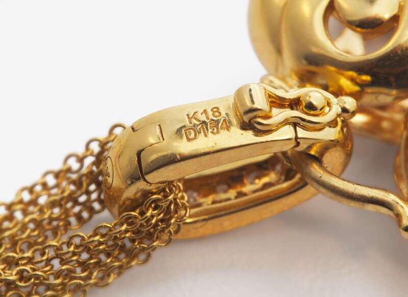 Overall Condition: Minor scratches and wear to metal, chain stamped “fancy 14Kt ITALY 585”, pendant stamped “K18 D154”, chain extension stamped “585”, clasps in working order.