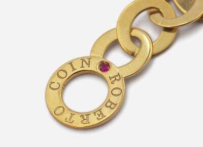 Necklace: Minor scratches and wear to metal, stamped "☆1220VI 18Kt ITALY ROBERTO COIN" with signature Roberto Coin ruby, chaine d'ancre clasp set with two round cabochon rubies each measuring approximately 2.90mm.