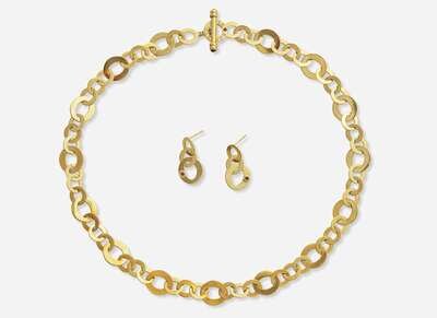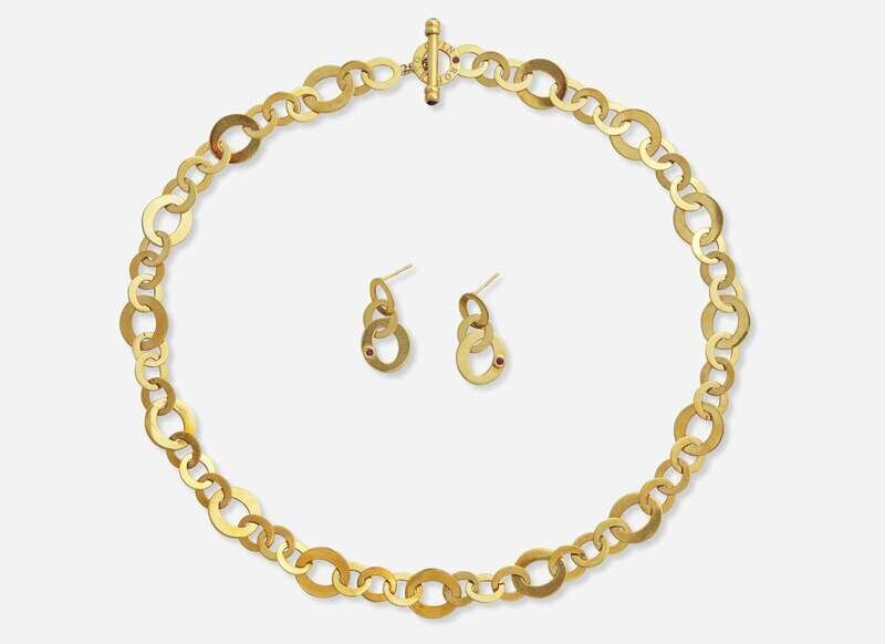 A matching set of 18K yellow gold jewelry by Roberto Coin, including a fancy link necklace designed as flattened circular loops of varying size ending in a chaine d'ancre clasp topped with cabochon sapphire finials, and a matching pair of earrings suitable for pierced ears on stud posts with butterfly earring backs.