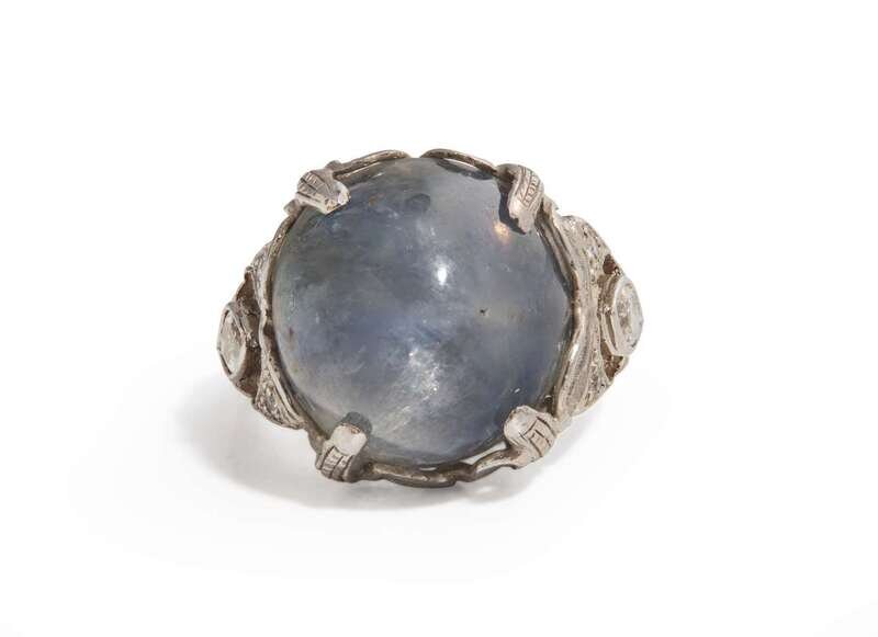 A ladies platinum Art Deco ring, featuring a prominent prong-set round cabochon sapphire, with marquise-cut, single-cut, and round brilliant-cut diamonds decorating the ornately engraved shank. Diamonds are near colorless (G – J), with SI – I clarity. Total estimated weight of diamonds: 0.50 carats.