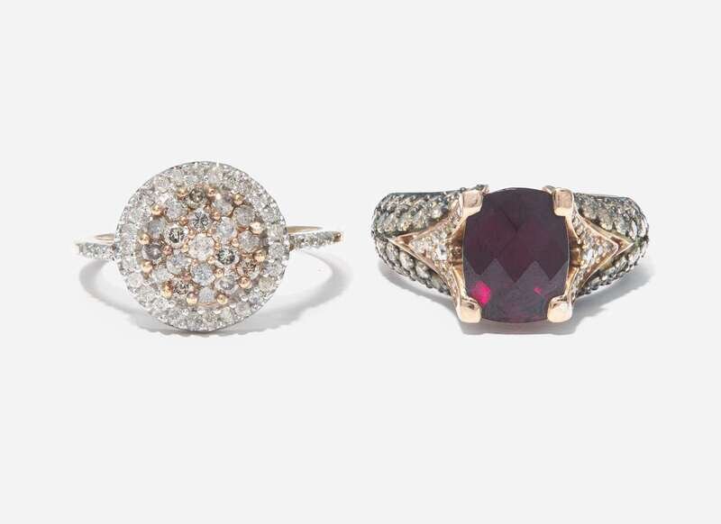 A set of two rings, including a 14K rose gold ring by Le Vian set with an oval faceted garnet measuring approximately 8.17mm x 10.40mm, with accents of light yellow and near colorless round brilliant-cut diamonds, and a 10K yellow gold ring set with a cluster of round brilliant-cut brown diamonds with near colorless to faint color round brilliant-cut diamond accents. Diamonds are SI - I clarity. Total estimated weight of diamonds: 1.88 carats.