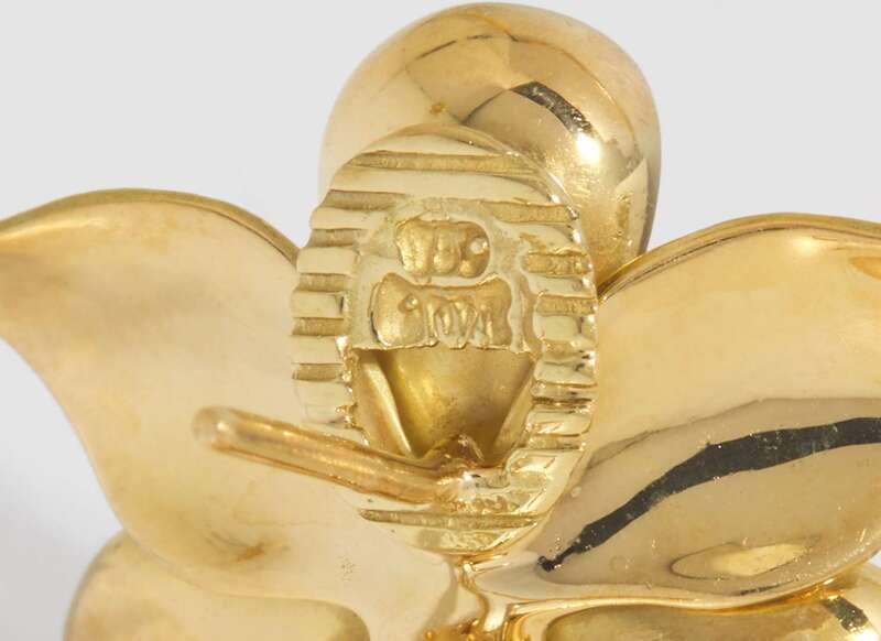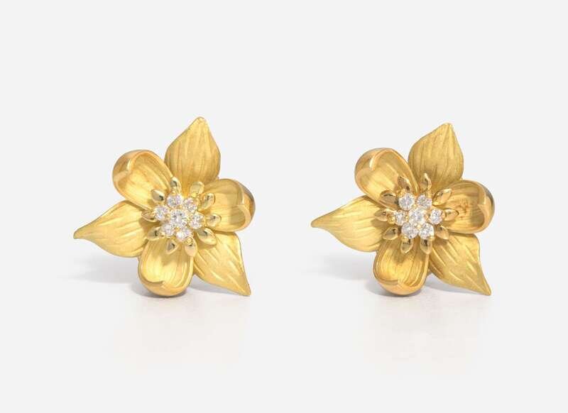 A pair of 18K yellow gold earrings, suitable for pierced ears on stud posts with omega clip backs, designed as dogwood blossoms, the petals of which are delicately textured so as to appear matte, and each centering a small cluster of round brilliant-cut diamonds. Diamonds are near colorless (G - J), with VS - SI clarity. Total estimated weight of diamonds: 0.30 carats.