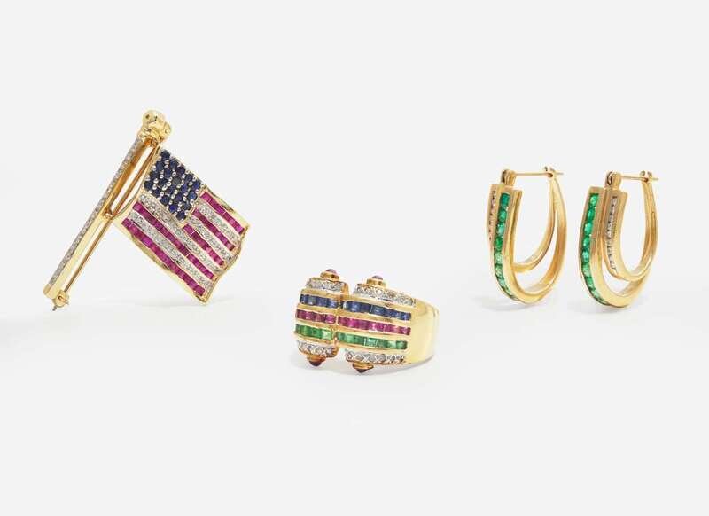 A collection of gold and gemstone jewelry, including a 14K yellow gold pin designed as the American flag and set with round-cut sapphires, calibre-cut rubies, and single-cut diamonds, a 14K yellow gold ring set with rows of single-cut diamonds and calibre-cut emeralds, sapphires, and rubies, and a pair of 14K yellow gold earrings suitable for pierced ears, set with rows of round-cut emeralds and round brilliant-cut diamonds. Diamonds are near colorless (G – J), with SI – I clarity. Total estimated weight of diamonds: 0.96 carats.