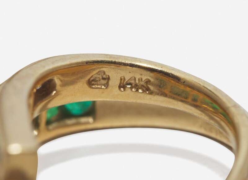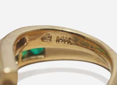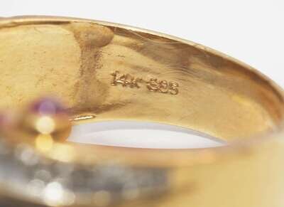 Ring: Significant scratches and wear to metal, stamped “14K 585” with maker’s mark, set with four round cabochon ruby finials each measuring approximately 2.00mm, fourteen calibre-cut emeralds each measuring approximately 1.50mm, fourteen calibre-cut rubies each measuring approximately 1.50mm, fourteen calibre-cut sapphires each measuring approximately 1.50mm, and twenty-eight single-cut diamonds each measuring approximately 1.00mm, near colorless (G – J), with SI – I clarity. Total estimated weight of diamonds: 0.14 carats.