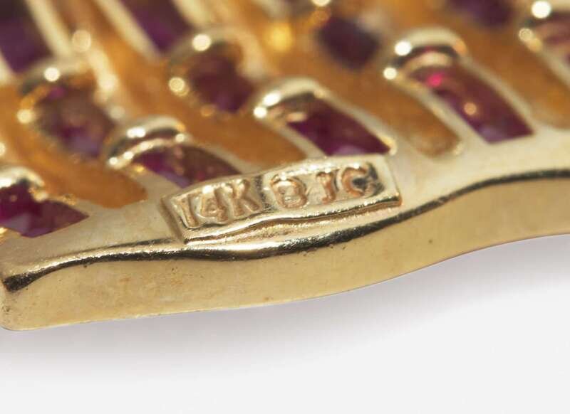 Pin: Light scratches and wear, stamped “14K BIC”, clasp in working order, set with forty-two calibre-cut rubies each measuring approximately 1.40mm, twenty round-cut sapphires each measuring approximately 1.60mm, and fifty-four single-cut diamonds each measuring approximately 1.40mm, near colorless (G – J), with SI – I clarity. Total estimated weight of diamonds: 0.70 carats.