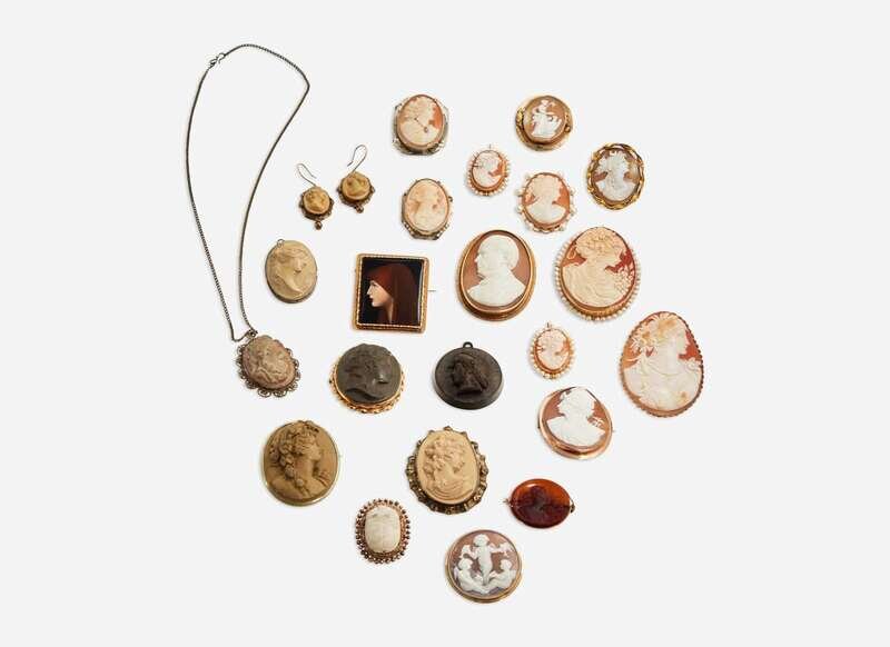 A collection of cameo jewelry, including six oval grand tour cameo brooches in gold settings depicting classical ladies, a round grand tour cameo brooch depicting three cherubs in a yellow gold setting, a scarab cameo brooch in a rose gold setting, two lava cameo brooches depicting ladies in silver settings, two lava cameo brooches depicting ladies in gold settings, a round lava cameo pendant depicting a man’s profile, a pair of lava cameo earrings in gold settings, a silver and lava cameo necklace on a silver chain, an 18K yellow gold rectangular brooch depicting a painted lady, a neo-classical oval cameo brooch depicting a man in a 14K yellow gold setting, a 14K white gold brooch featuring a grand tour cameo depicting a lady and set with seed pearls, and four 14K yellow gold brooches each set with pearls and an oval grand tour cameo.
