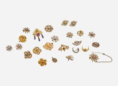 A collection of Victorian scatter pins and jewelry, including four 10K yellow gold pins variously set with seed pearls and diamonds, fifteen 14K yellow gold brooches variously set with pearls and diamonds, a 14K yellow gold and black enamel pendant set with amethysts, a 14K yellow gold pendant depicting a woman with bezel-set diamond accents, a 9K yellow gold oval pendant set with seed pearls and round-cut sapphires, and a pair of 14K yellow gold earrings on stud posts with screw-down earring backs, set with round white pearls with blue enamel accents.