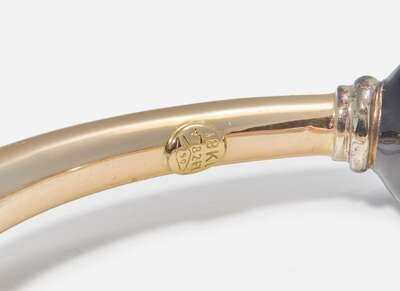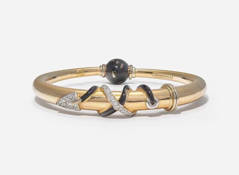 Overall Condition: Light scratches and wear to metal, some enamel loss particularly on the arrow, stamped "18Kt 782F1 750 la NOUVELLE BAGUE".