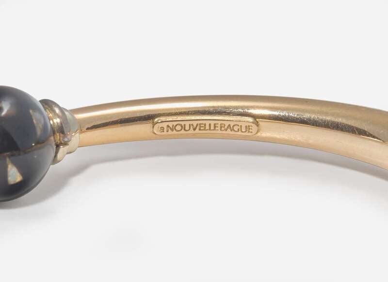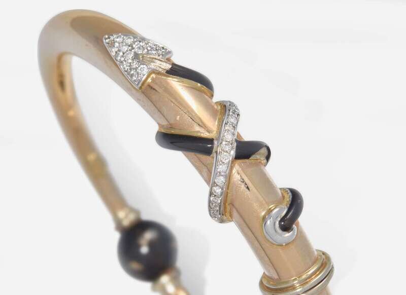 An 18K rose gold bangle bracelet by La Nouvelle Bague, featuring a twisting arrow comprised of black enamel and round brilliant-cut diamonds, and a black enamel bauble on the underside. Diamonds are near colorless (G - J), with VS - SI clarity. Total estimated weight of diamonds: 0.48 carats.