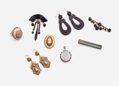 A collection of miscellaneous Victorian jewelry, including a drop brooch set with black onyx and black enamel accents, a pair of cameo drop earrings, a pin set with enamel and black onyx round and faceted beads, a yellow gold cameo brooch, a pair of drop earrings crafted from gutta-percha, a silver pendant featuring a round opal, a textured yellow gold pin set with a row of square-cut turquoise, and a 14K yellow gold ring set with a large cabochon banded stone.