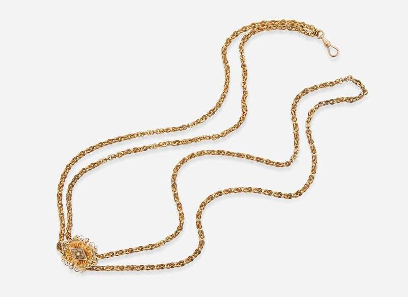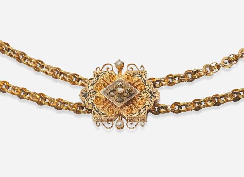 A long 14K yellow gold pocket watch chain, with textured yellow gold fancy links, completed by a delicately textured slider with black foliage enamel accents, set with three seed pearls.