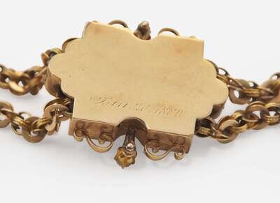 Overall Condition: Significant scratches and wear to metal, clasp and slider in working order, not legibly stamped, testing as 14K, set with three seed pearls measuring from approximately 2.24mm at the smallest to approximately 3.40mm at the largest, back of slider is engraved “Jan. 20. 1880”.