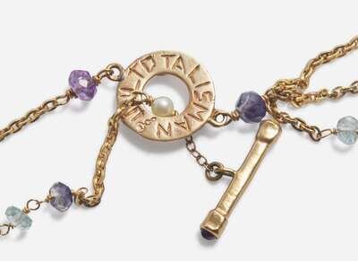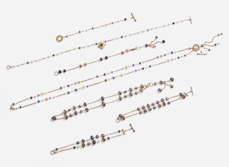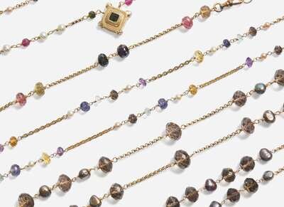 Overall Condition: Minor scratches and wear to all jewelry, all clasps in working order, all pieces stamped “14K”, two necklaces stamped “UNLTD TALISMAN”, variously set with white, brown, and black and pink pearls, and faceted beads crafted from quartz, amethyst, emerald, iolite, aquamarine, pink tourmaline, onyx, garnet, and citrine.