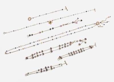 An assorted collection of 14K yellow gold beaded jewelry, including a two-strand bracelet set with baroque Tahitian pearls and faceted quartz beads, a two-strand bracelet set with semi-baroque to round white and black pearls and faceted quartz beads, a fob chain set with quartz, emerald, garnet, citrine, and onyx faceted beads, a fancy link necklace set with pearls and faceted beads of quartz, onyx, emerald, and pink tourmaline with a yellow gold, pearl, and emerald pendant, a bracelet set with white and pink pearls, and cabochon and faceted beaded amethyst, quartz, aquamarine, and iolite, a long necklace set with pink and white pearls and quartz, amethyst, citrine, iolite, and aquamarine cabochons and faceted beads, and a necklace set with baroque brown and Tahitian pearls and faceted quartz and citrine beads.