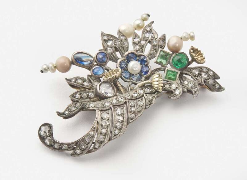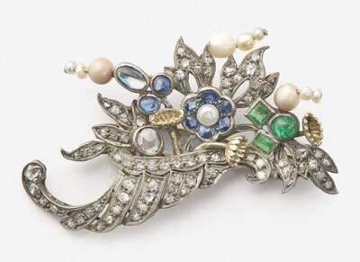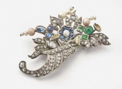 A cornucopia brooch by Harman & Company, crafted from silver and 14K yellow gold, depicting flowers and foliage set throughout with rose-cut and single-cut diamonds, round-cut and cabochon sapphires, emeralds, and natural pearls. Diamonds are near colorless (G – J), with SI – I clarity. Total estimated weight of diamonds: 1.75 carats.
