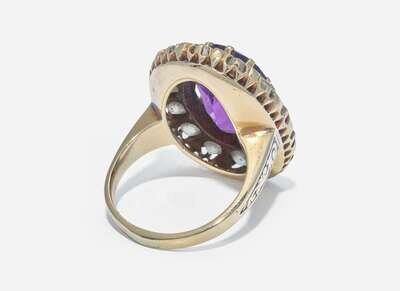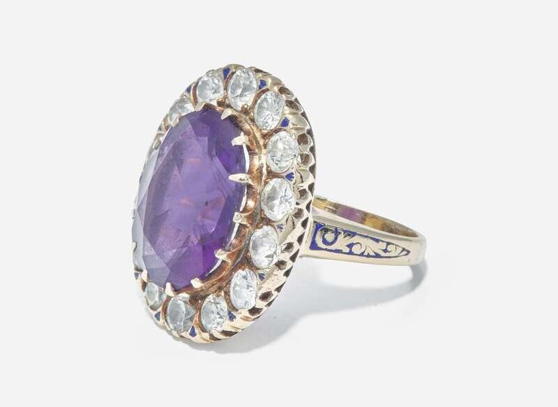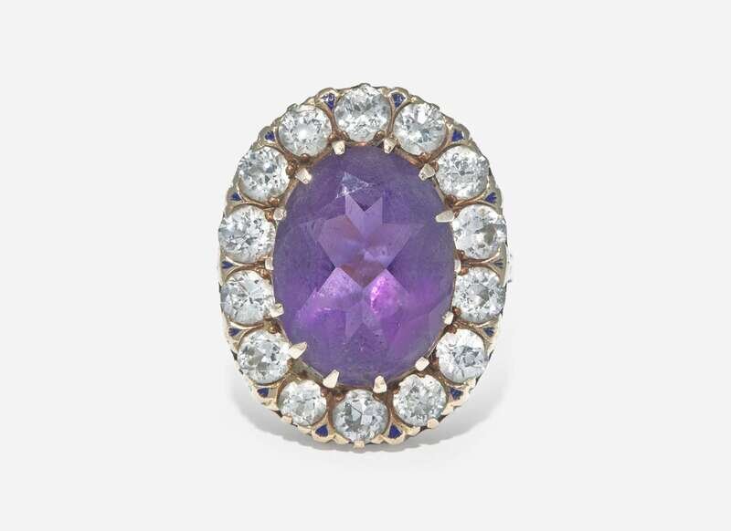 A 10K yellow gold ring centering an oval-cut amethyst measuring approximately 11.95mm x 16.00mm, surrounded by a halo of round brilliant-cut diamonds, with accents of blue enamel between each diamond as well as leading down the shank. Diamonds are near colorless (G - J), with SI - I clarity. Total estimated weight of diamonds: 2.38 carats.