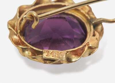 Earrings: Measure approximately 5/8in long, stamped “14K”, set with two oval-cut amethyst each measuring approximately 9.50mm x 11.70mm.