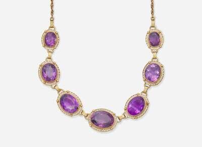 Necklace: Measures approximately 16 1/2in long, light scratches and wear to metal, stamped “14KT”, clasp in working order, set with seven oval-cut amethyst measuring from approximately 8.90mm x 11.30mm at the smallest to approximately 13.00mm x 17.50mm at the largest.