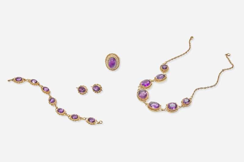 A collection of ladies 14K yellow gold and amethyst jewelry, including a ring set with an oval-cut amethyst surrounded by a halo of seed pearls, a pair of earrings suitable for pierced ears each set with an oval-cut amethyst, a bracelet set with seven oval-cut amethysts, and a necklace set with seven graduated oval-cut amethysts.