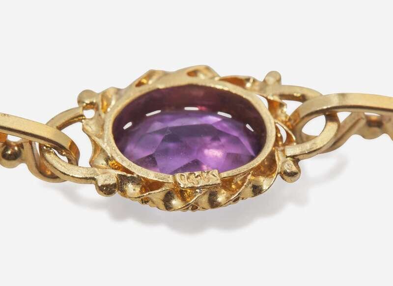 Bracelet: Measures approximately 7 3/8in long, stamped “14K”, clasp in working order, set with seven oval-cut amethyst each measuring approximately 8.00mm x 10.50mm.