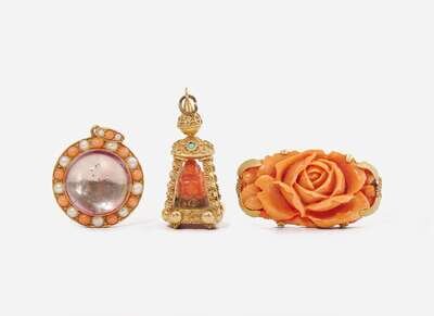 A collection of coral jewelry, including a 14K yellow gold brooch set with a carved coral rose, an 18K yellow gold Etruscan revival charm set with a carved coral figurine and four round cabochon turquoise, and an 18K yellow gold pendant featuring a round cabochon amethyst surrounded by a halo of round cabochon coral and white pearls.