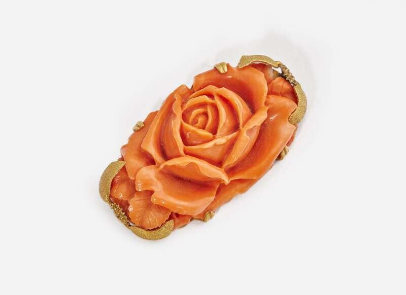 Brooch: Scratches and wear, significant area of discoloration to back of brooch, clasp in working order, stamped “14K”, set with a carved coral measuring approximately 23.40mm x 41.23mm x 10.75mm.