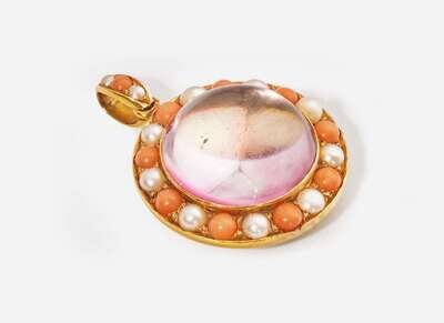 Pendant: Significant scratches and wear, particularly to back of pendant, set with ten round cabochon coral measuring from approximately 2.74mm at the smallest to approximately 3.50mm at the largest, a round cabochon amethyst measuring approximately 19.87mm, and eleven round white pearls measuring from approximately 1.80mm at the smallest to approximately 3.50mm at the largest.