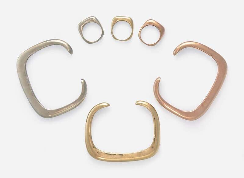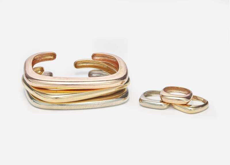 A collection of matching tri-color gold bracelets and rings, the bracelets designed as a modern rectangular open cuff, each in yellow, white, and rose gold, with matching ring counterparts.
