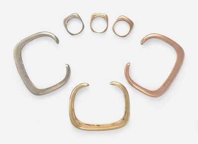 Bracelet Interior Circumference: 6 1/4in; Bracelet Opening: 1in; Ring Sizes: 6 ½; Weight: 65.1 Gross dwt.
