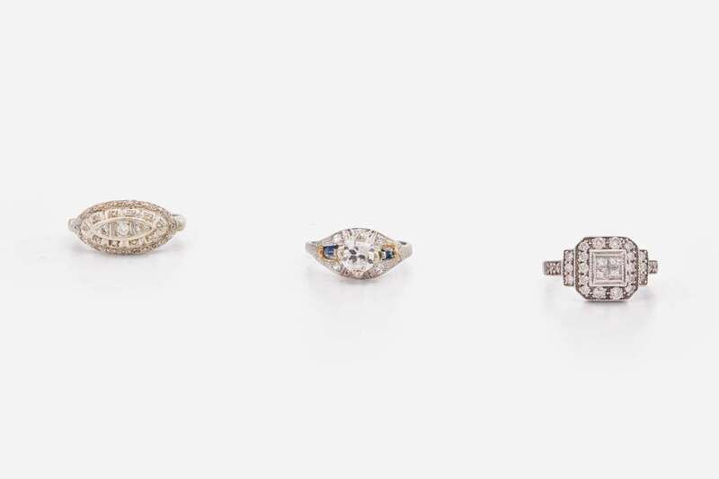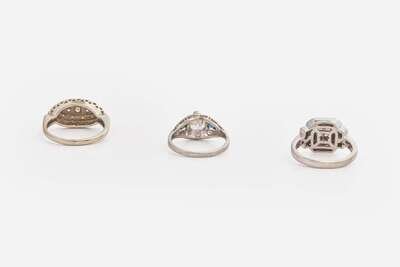 Tiered Ring Size: 7; Platinum Ring Size: 5 ½; Princess-Cut Diamond Ring Size: 4 ½; Weight: 6.5 Gross dwt.