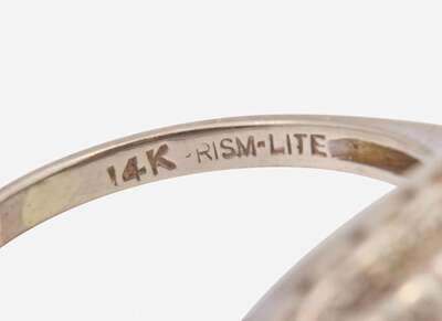 Tiered Ring: Significant scratches and wear, stamped “14K PRISM-LITE” partially rubbed away, set with sixteen single-cut diamonds each measuring approximately 0.80mm, ten single-cut diamonds each measuring approximately 1.00mm, two single-cut diamonds each measuring approximately 1.45mm, and one round brilliant-cut diamond measuring approximately 2.20mm, near colorless (G – J), with SI – I clarity. Total estimated weight of diamonds: 0.15 carats.