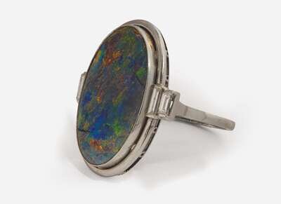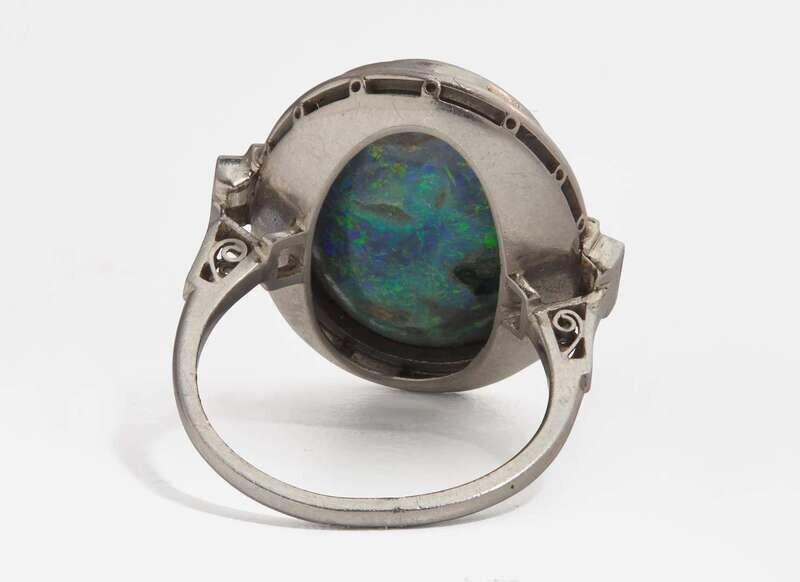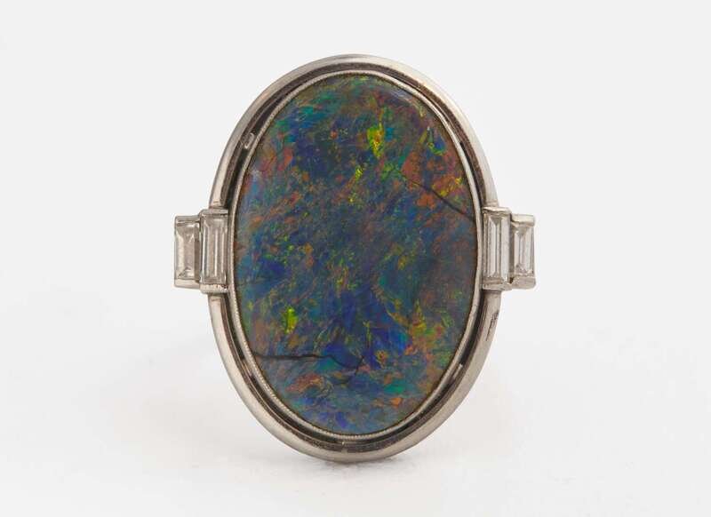 A ladies platinum ring featuring a large bezel-set oval opal, with tiered straight baguette-cut diamond accents flanking the opal at the top of the shank. Diamonds are near colorless to faint color (H – K), with SI – I clarity. Total estimated weight of diamonds: 0.34 carats.