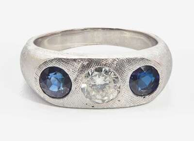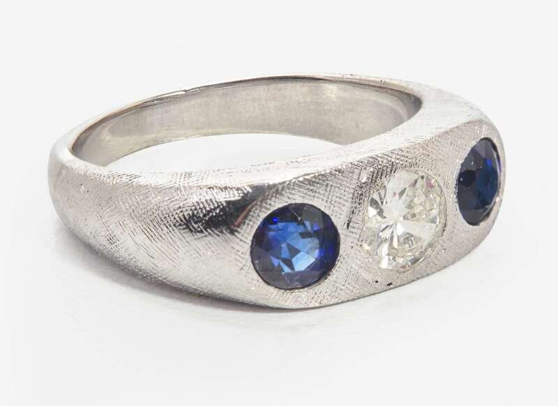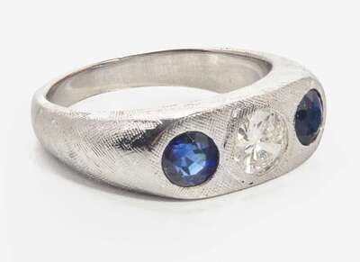 An 18K white gold ring featuring a wide lightly textured band with a flat head, centering a round brilliant-cut diamond, near colorless (G – J), with SI2 – I1 clarity, flanked by two round-cut sapphires. The underside and bottom of the shank is smooth white gold. Total estimated weight of diamond: 0.66 carat.