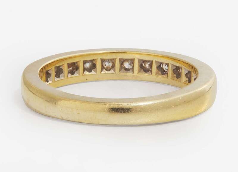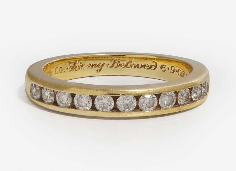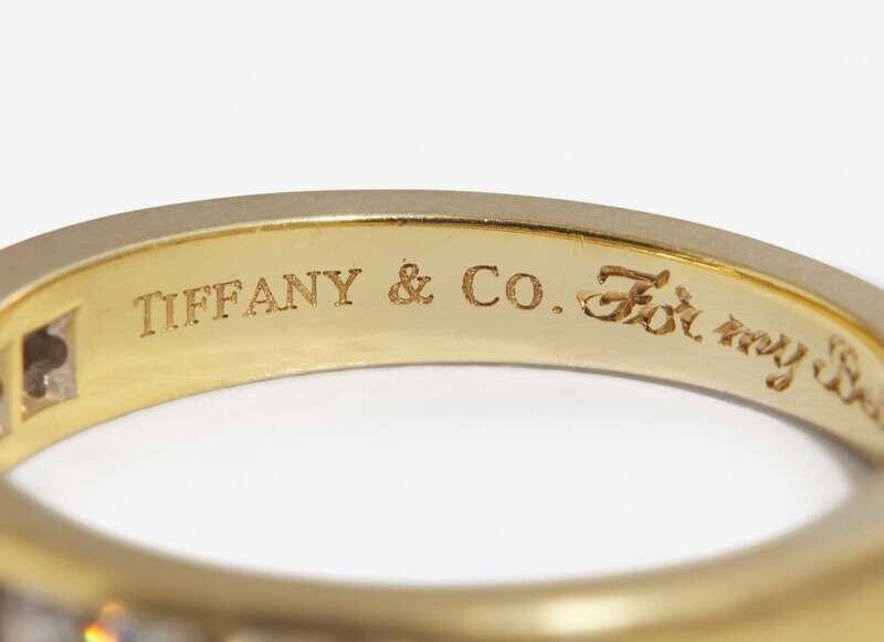 An 18K yellow gold band by Tiffany & Company, channel-set along the top of the ring with round brilliant-cut diamonds. Diamonds are near colorless (G – J), with VS – SI clarity. Total estimated weight of diamonds: 0.44 carats.