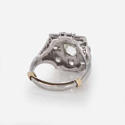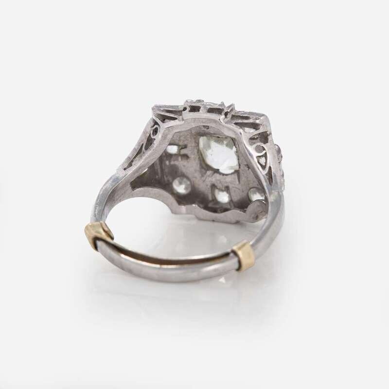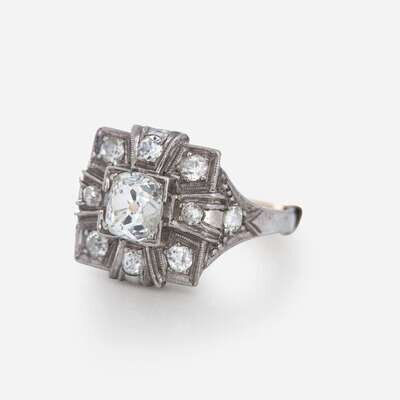 Diamonds: One old mine-cut diamond measuring approximately 5.42mm c 6.02mm, approximately 1.14 carats, and ten old mine-cut and old European-cut diamonds measuring from approximately 1.80mm at the smallest to 2.40mm at the largest, near colorless (G - H), with VS clarity, one accent diamond has a chip at cleavage plane. Total estimated weight of diamonds: 1.64 carats.