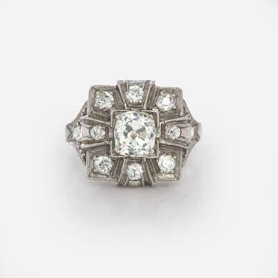 A ladies platinum ring centering an old mine-cut diamond weighing approximately 1.14 carats, surrounded by ten old mine-cut and old European-cut diamonds. Diamonds are near colorless (G - H), with VS clarity. Total estimated weight of diamonds: 1.64 carats.