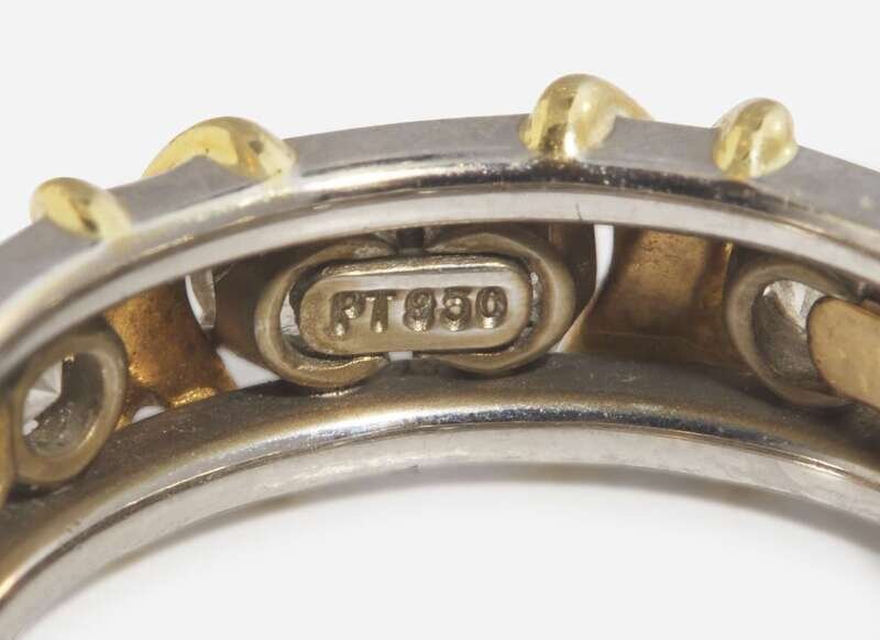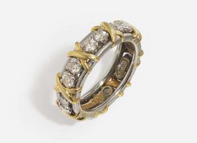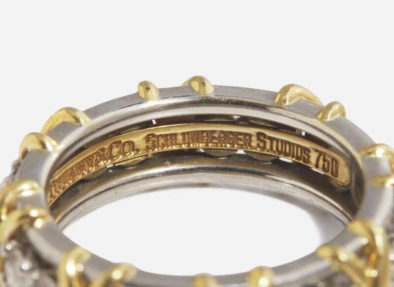 A ring by Jean Schlumberger for Tiffany & Company, crafted from platinum and set with alternating round brilliant-cut diamonds and 18K yellow gold X’s. Diamonds are colorless (F), with VS clarity. Total estimated weight of diamonds: 1.14 carats.