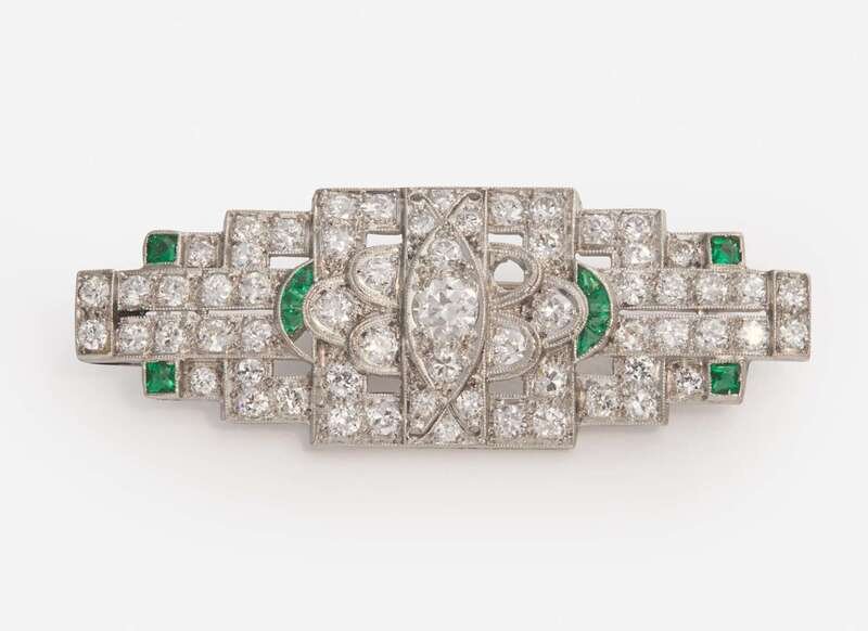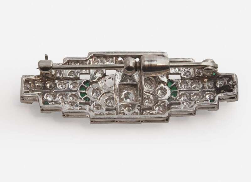An Art Deco brooch, crafted in a geometric pattern from platinum and set throughout with round brilliant-cut diamonds, with calibre-cut emerald accents. Diamonds are near colorless (G – J), with SI – I clarity. Total estimated weight of diamonds: 1.45 carats.