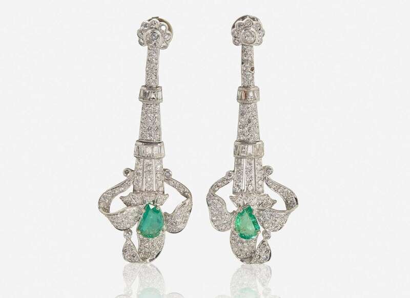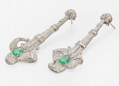 A pair of platinum and 18K gold earrings, set throughout with variously-sized old mine-cut, round brilliant-cut, and tapered baguette-cut diamonds, and featuring modified pear-shape emeralds at the drop, suitable for pierced ears on stud posts with butterfly clip backs. Diamonds are near colorless to faint floor (H – L), with SI – I clarity. Total estimated weight of diamonds: 5.00 carats.