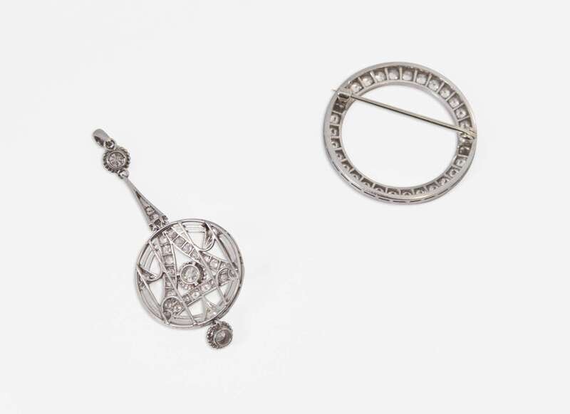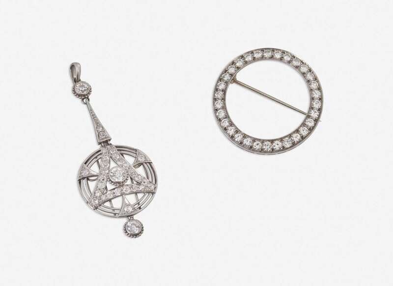 A platinum brooch designed as a ring of round brilliant-cut diamonds, together with an Art Deco platinum pendant designed as a geometric drop with patterns of pave-set and bezel-set old European-cut diamonds throughout. Diamonds are near colorless (G – J), with SI – I clarity. Total estimated weight of diamonds: 2.50 carats.